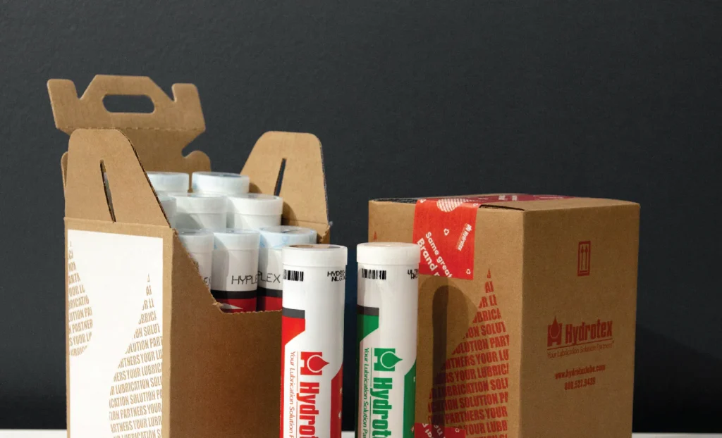 Hydrotex has maximized the use of recycled material for grease cartridge packaging by switching to kraft linerboard. The 100% recyclable 9-packs and over-boxes will ensure durability without the need for non-biodegradable foams or padding, and are sourced according to requirements of the Sustainable Forestry Initiative.